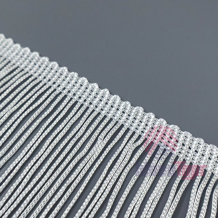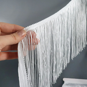Длина ниспадающих нитей составляет 20 см, а ширина пришивного элемента (тесьмы) — 1 см.