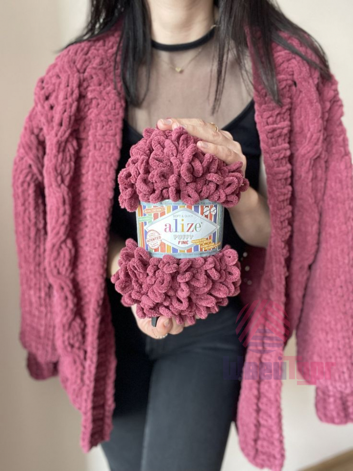 В отличие от классической "пуффи" Ализе Пуффи Файн тоньше, а моток имеет соответственно бОльшую намотку.