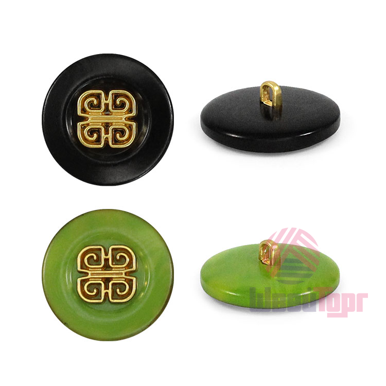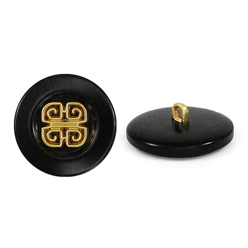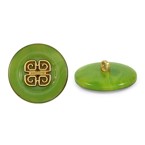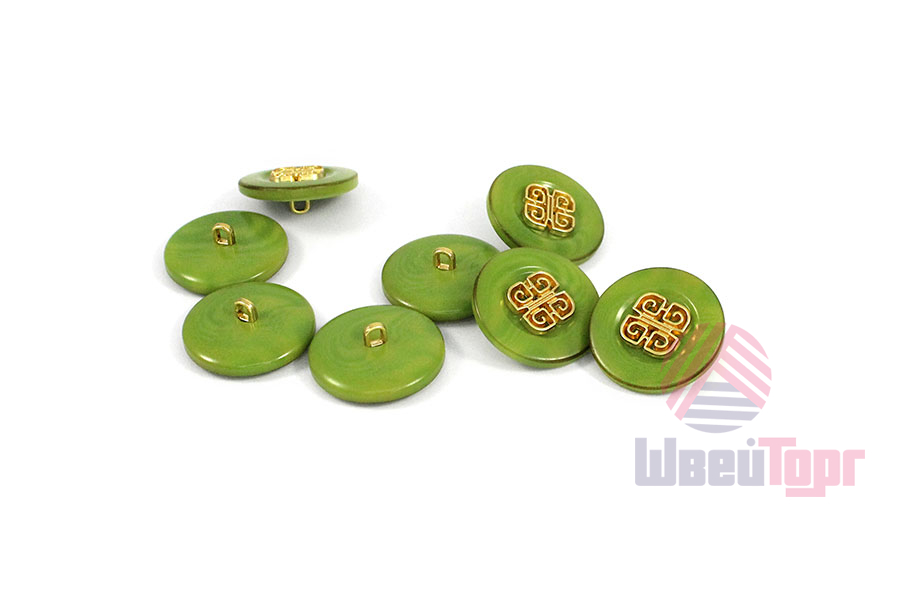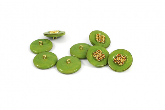 Главная особенность данной пуговицы – декоративный накладной элемент, который создаёт яркий акцент. Благородный блеск золотого центрального элемента, эффектно контрастирует с основными цветами пуговицы – кремовым, зелёным и чёрным, позволяя подобрать идеальный вариант под любой стиль.