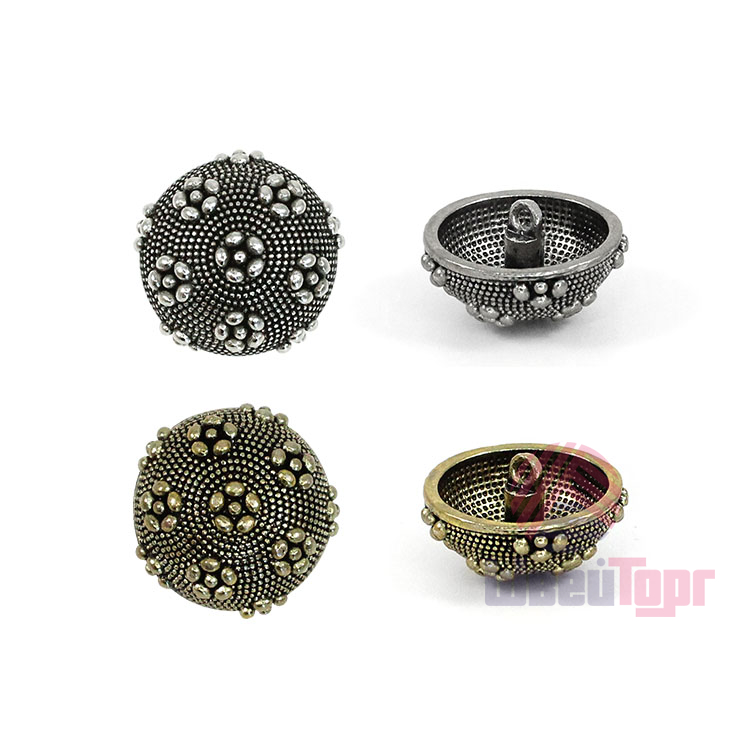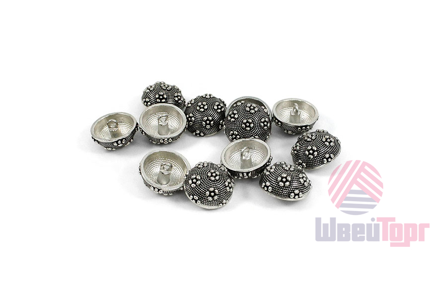Пуговица доступна в двух цветах – чернённый и антик – оба варианта выгодно подчёркивают рельефную поверхность и добавляют пуговице нотку роскоши. Прочная ножка обеспечивает удобное пришивание, а необычный дизайн делает эту пуговицу настоящим акцентом в любом образе. Данные пуговицы прекрасно подойдут для ваших костюмов и жакетов.