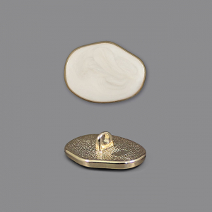 Эти металлические пуговицы на ножке сочетают в себе прочную основу и лицевую вставку из акрила, окаймлённую тонким металлическим ободком. У пуговиц уникальная, плавная асимметричная форма, которая придаёт минималистичному дизайну оригинальный и стильный характер. Перламутровые разводы с мерцающими блёстками создают изысканную игру света.