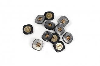 Эта пуговица из пластика с лёгким перламутровым эффектом привлечёт внимание изящной деталью: в центре квадрата, с мягко скруглёнными углами, расположена изысканная золотая решётчатая вставка.