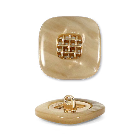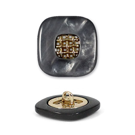 Эта пуговица из пластика с лёгким перламутровым эффектом привлечёт внимание изящной деталью: в центре квадрата, с мягко скруглёнными углами, расположена изысканная золотая решётчатая вставка.