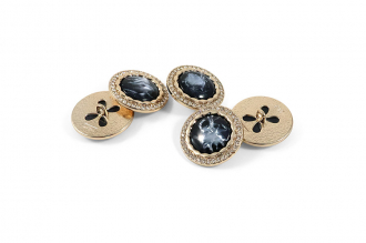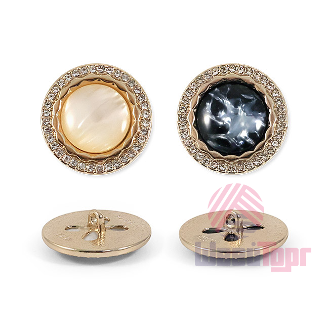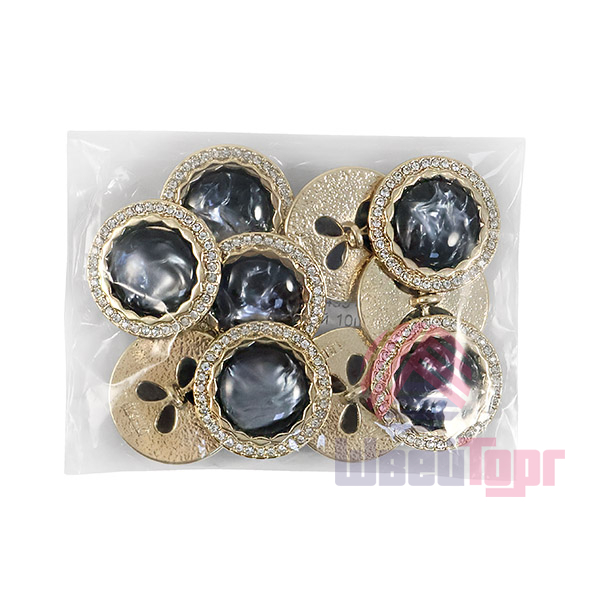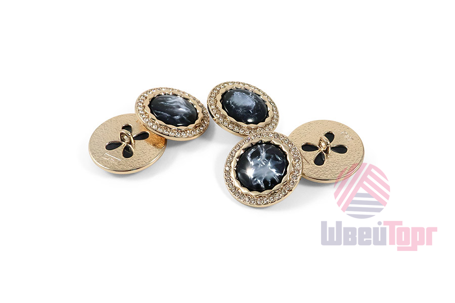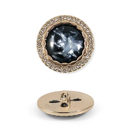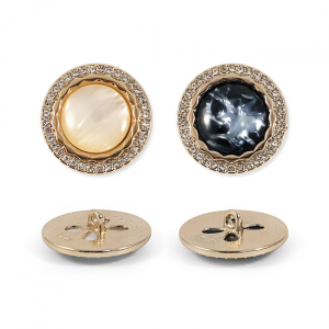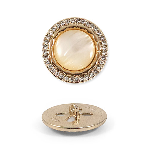 Эта металлическая пуговица диаметром 23 мм на удобной ножке, станет яркой деталью для вашего жакета или костюма. Её золотистая основа по краю украшена россыпью мелких стразов, а центральная выпуклая вставка из акрила, переливающаяся перламутром, добавляет объём и игру света.