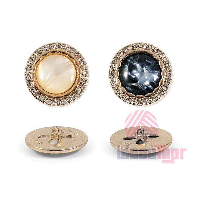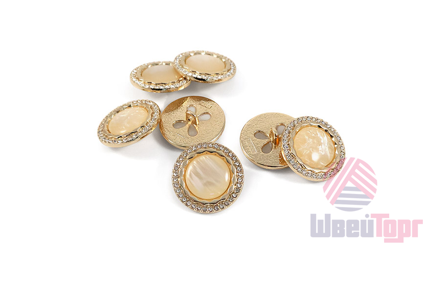 Эта металлическая пуговица диаметром 22 мм на удобной ножке, станет яркой деталью для вашего жакета или костюма. Её золотистая основа по краю украшена россыпью мелких стразов, а центральная выпуклая вставка из акрила, переливающаяся перламутром, добавляет объём и игру света.