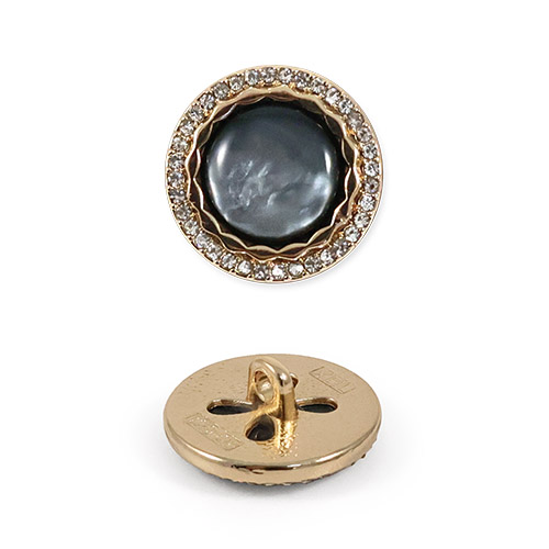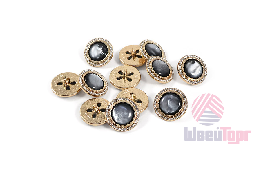 Эта металлическая пуговица диаметром 17 мм на удобной ножке, станет яркой деталью для вашего жакета или костюма. Её золотистая основа по краю украшена россыпью мелких стразов, а центральная выпуклая вставка из акрила, переливающаяся перламутром, добавляет объём и игру света.