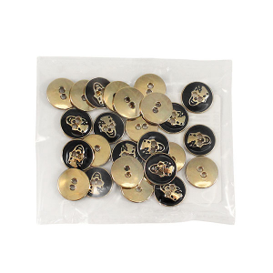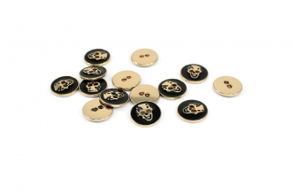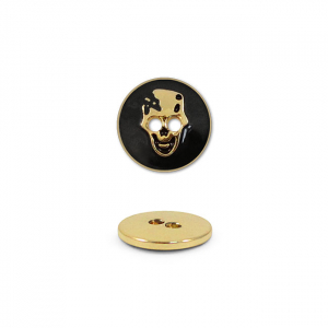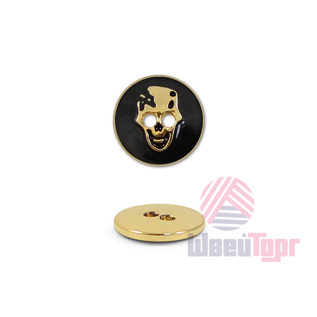 Эта металлическая пуговица на два прокола обладает ярким характером. Её глянцевую чёрную поверхность украшает контрастный золотистый гравированный череп, где глазницы служат функциональными отверстиями для пришивания пуговицы.