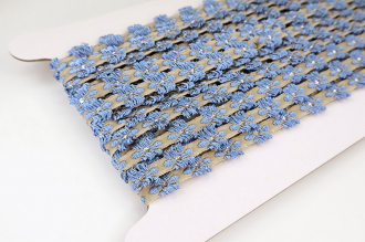 Декоративная, но при этом весьма лаконичная, тесьма с вышитыми объемными элементами в форме шестилистных цветов. Элементы расположены на равном расстоянии посередине бежевой текстильной ленты (ширина бежевой основы около 6 мм). Ширина цветка около 11 мм. Сердцевина каждого цветка украшена серебристым люрексом.