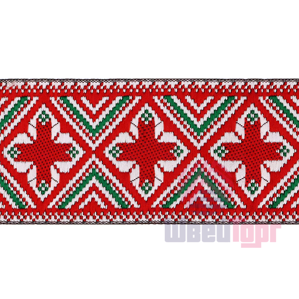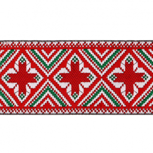 Данная жаккардовая тесьма обладает высокой прочностью, устойчива к растяжению и истиранию. Так как рисунок формируется непосредственно в процессе плетения, что придаёт тесьме эффект вышивки, тесьма сохраняет яркость цветов и не теряет своего внешнего вида долгое время. Рельефный узор тесьмы представляет собой геометрический орнамент. Благодаря высококачественному полиэстеру, из которого она изготовлена, тесьма сохраняет насыщенность цветов даже при частом использовании.