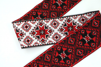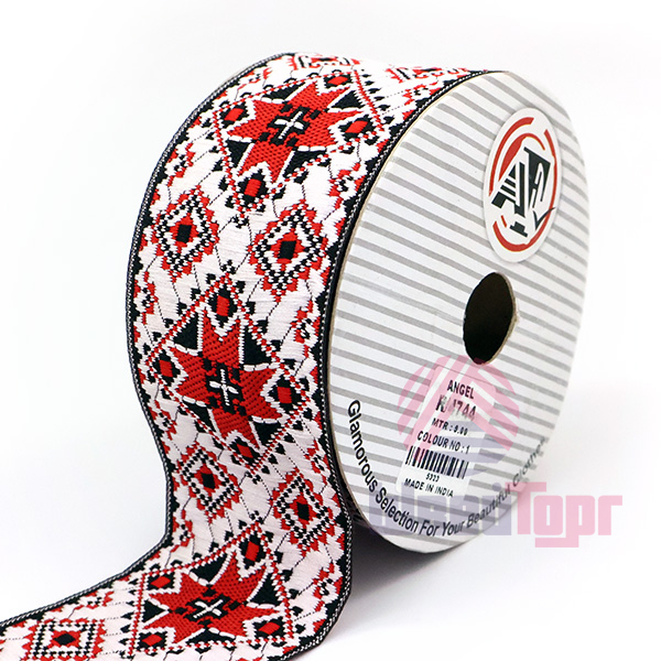 Данная жаккардовая тесьма обладает высокой прочностью, устойчива к растяжению и истиранию. Так как рисунок формируется непосредственно в процессе плетения, что придаёт тесьме эффект вышивки, тесьма сохраняет яркость цветов и не теряет своего внешнего вида долгое время. Рельефный узор тесьмы представляет собой геометрический орнамент. Благодаря высококачественному полиэстеру, из которого она изготовлена, тесьма сохраняет насыщенность цветов даже при частом использовании.