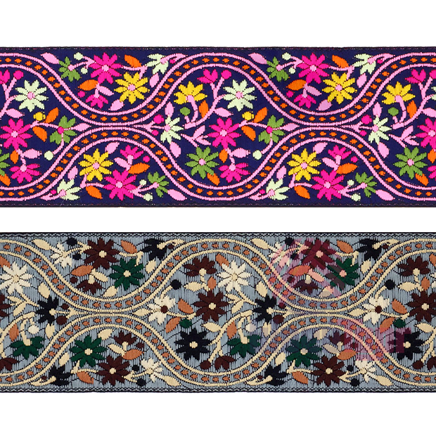Данная жаккардовая тесьма обладает высокой прочностью, устойчива к растяжению и истиранию. Так как рисунок формируется непосредственно в процессе плетения, что придаёт тесьме эффект вышивки, тесьма сохраняет яркость цветов и не теряет своего внешнего вида долгое время. Рельефный узор тесьмы представляет собой геометрический орнамент. Благодаря высококачественному полиэстеру, из которого она изготовлена, тесьма сохраняет насыщенность цветов даже при частом использовании.
