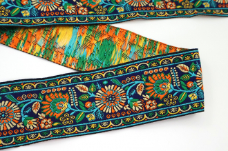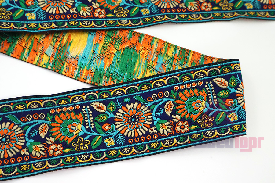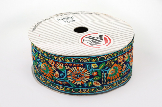 Данная жаккардовая тесьма обладает высокой прочностью, устойчива к растяжению и истиранию. Так как рисунок формируется непосредственно в процессе плетения, что придаёт тесьме эффект вышивки, тесьма сохраняет яркость цветов и не теряет своего внешнего вида долгое время. Рельефный узор тесьмы представляет собой геометрический орнамент. Благодаря высококачественному полиэстеру, из которого она изготовлена, тесьма сохраняет насыщенность цветов даже при частом использовании.