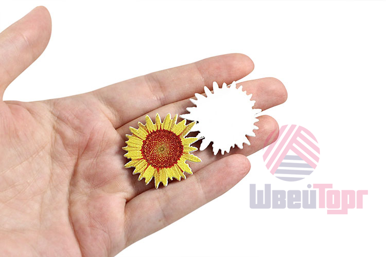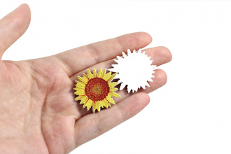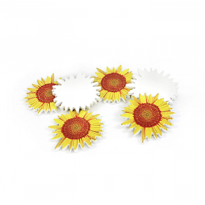 Натуральное деревянное украшение в форме подсолнуха. Лицевая сторона ярко окрашена детализированным рисунком, обратная – покрыта белым цветом. Диаметр украшения: 30 мм.