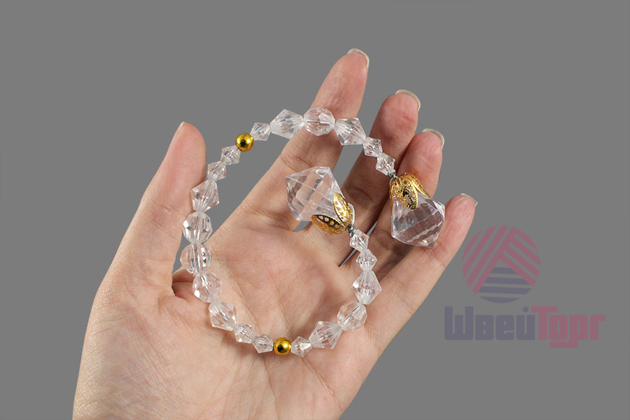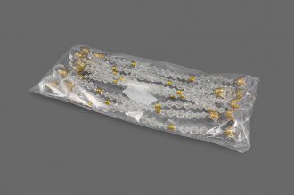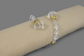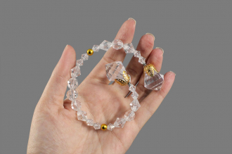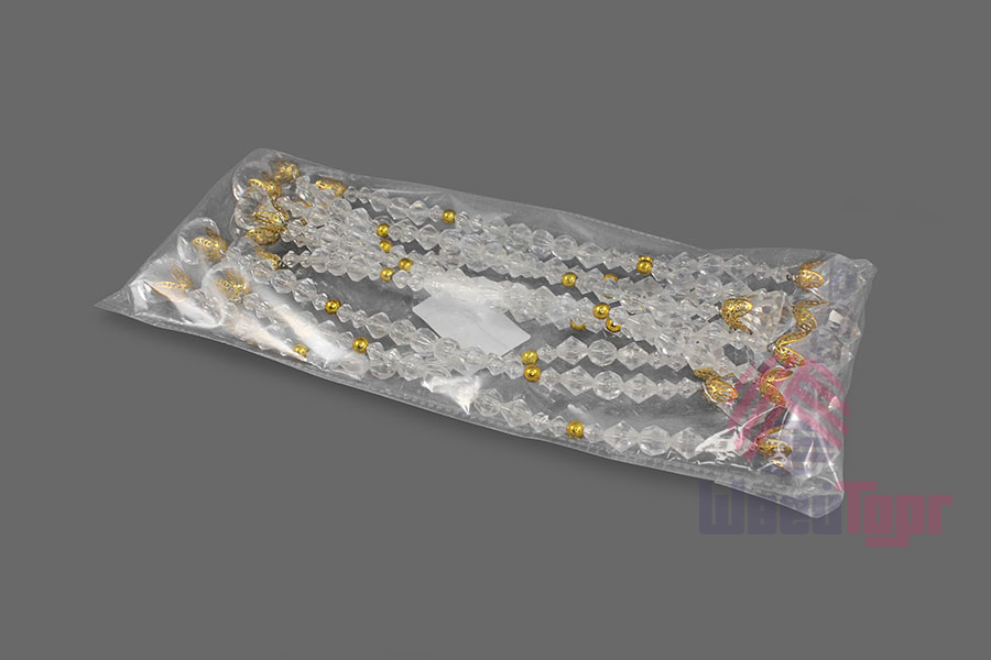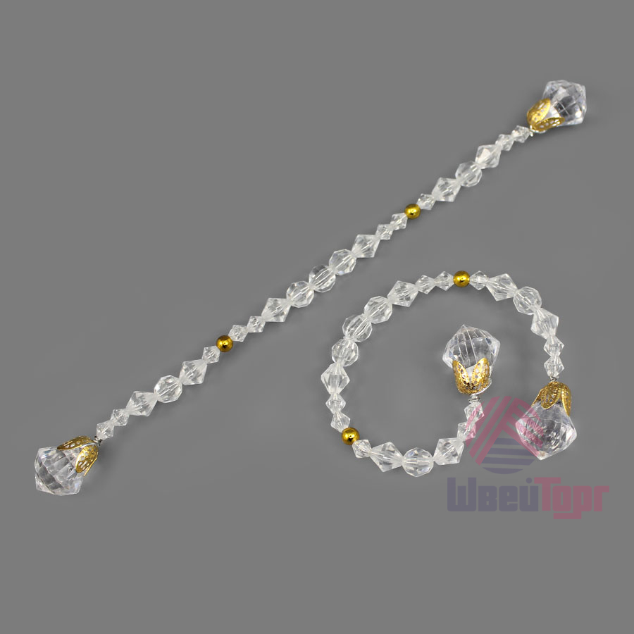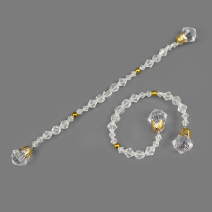 Готовый элемент декора из прозрачных гранёных бусин с золотыми акцентами на прочной проволочной основе, которая позволяет легко придавать ему любую желаемую форму. Крупные бусины на концах (D-2см), обрамлённые изысканными золотистыми резными концевиками, добавляют композиции выразительности.